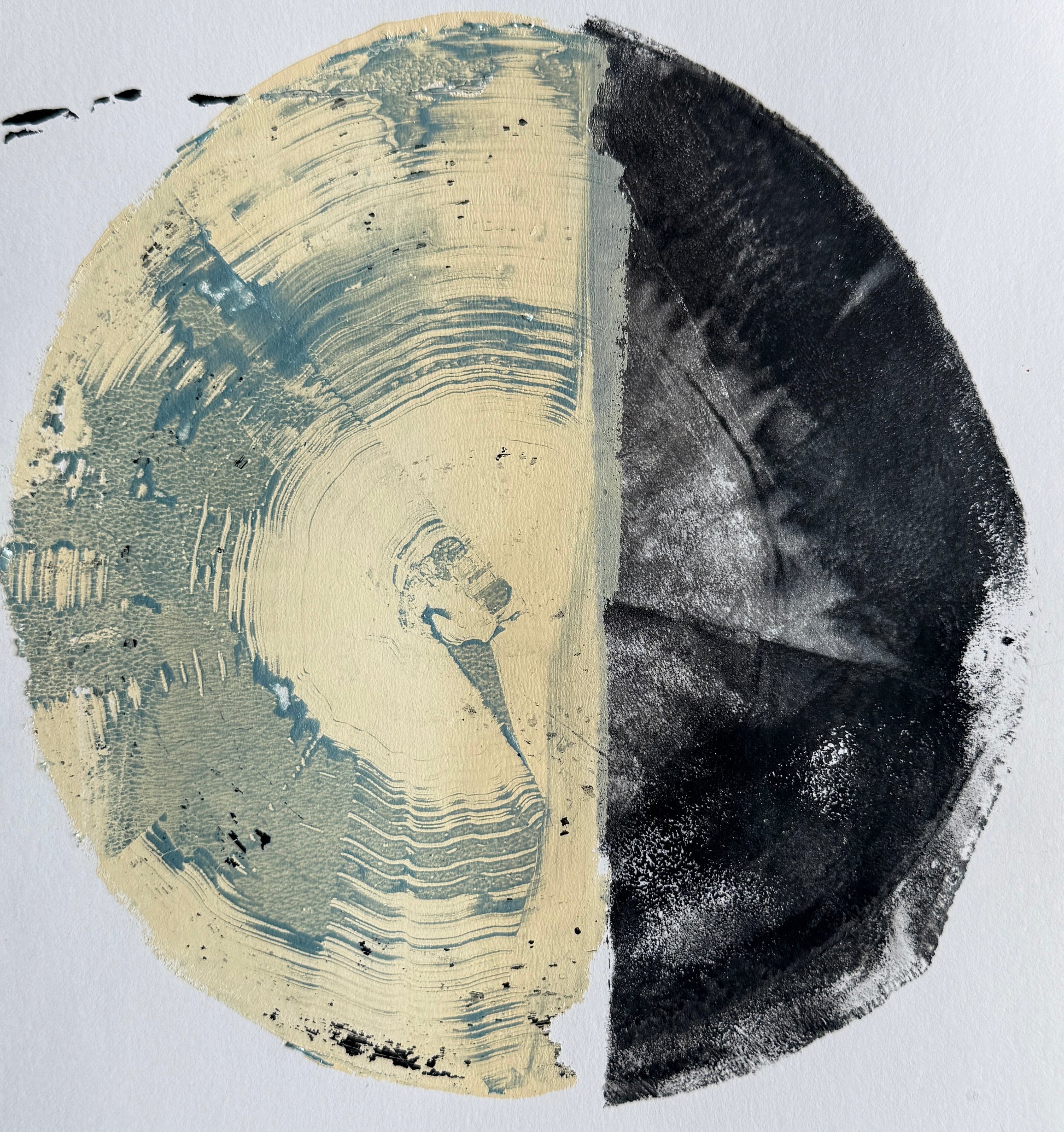 This expressive monoprint depicts a log’s cross section divided between blue and black ink, merging natural form with modern abstraction. The alternating hues highlight the intricate growth rings and textures of the wood, symbolizing balance between organic life and artistic interpretation. The blue half introduces a sense of depth and calm, while the black anchors the composition with strength and contrast—together tracing time’s quiet rhythm in nature’s design.