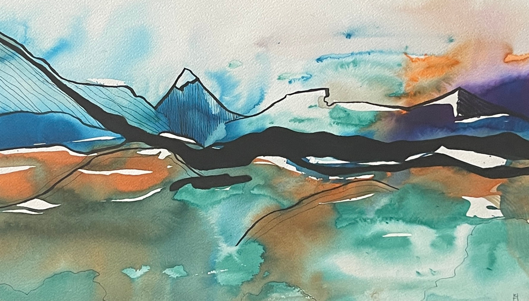 Fire on the Mountain is an abstract watercolor and hot wax painting that captures the vibrant meeting of earth, water, and sky along a ridgeline. Layers of translucent pigment and wax flow together, creating a luminous interplay of texture and color — fiery oranges rising through cool blues and soft mountain tones. The forms blur and merge, suggesting the moment when light ignites the horizon and the boundaries between mountain, water, and sky dissolve. Energetic yet fluid, the piece evokes both the power and serenity of nature in motion.