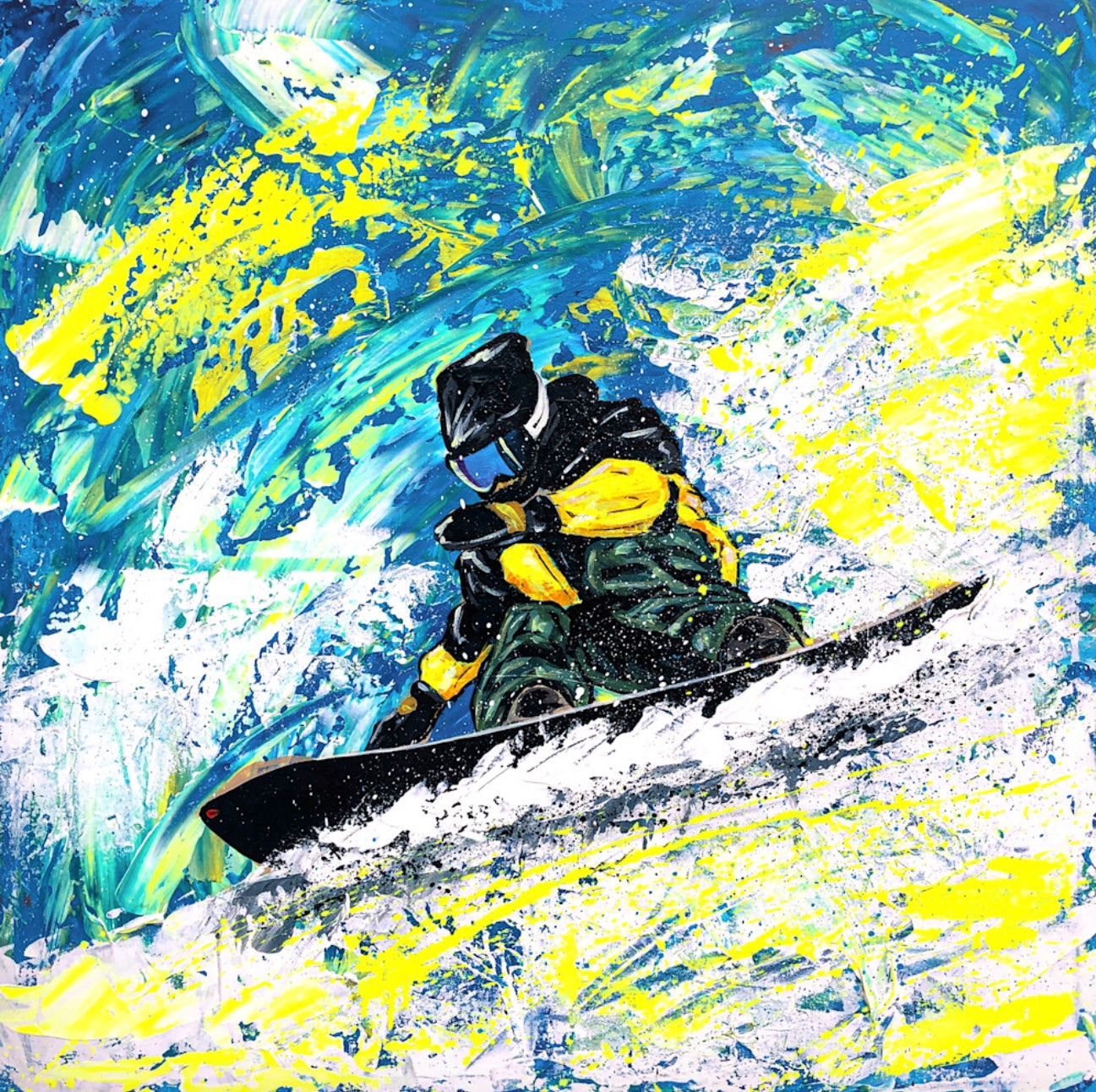 An abstract portrayal of a snowboarder in a yellow jacket carving through layers of white and yellow snow, the motion captured in fluid, energetic strokes. The blue and yellow sky above mirrors the warmth and movement below, creating a harmonious flow between earth and atmosphere. The figure seems to merge with the landscape, embodying both momentum and ease. The composition radiates light and energy — a vivid study of balance, freedom, and the joy of movement across color and snow.