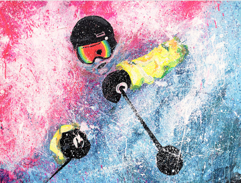 A powerful portrayal of determination and contrast, this artwork captures a skier buried chest-deep in swirling white and blue snow, fiercely driving his poles through the powder. The sky above burns in an intense pink that verges on red, creating a vivid tension with the cool tones of the snow below. A bold diagonal line separates the two worlds — fire above, ice below — giving the composition a sense of urgency and motion. The piece embodies both the struggle and exhilaration of pushing forward through nature’s extremes.