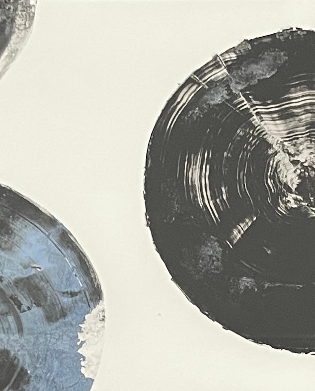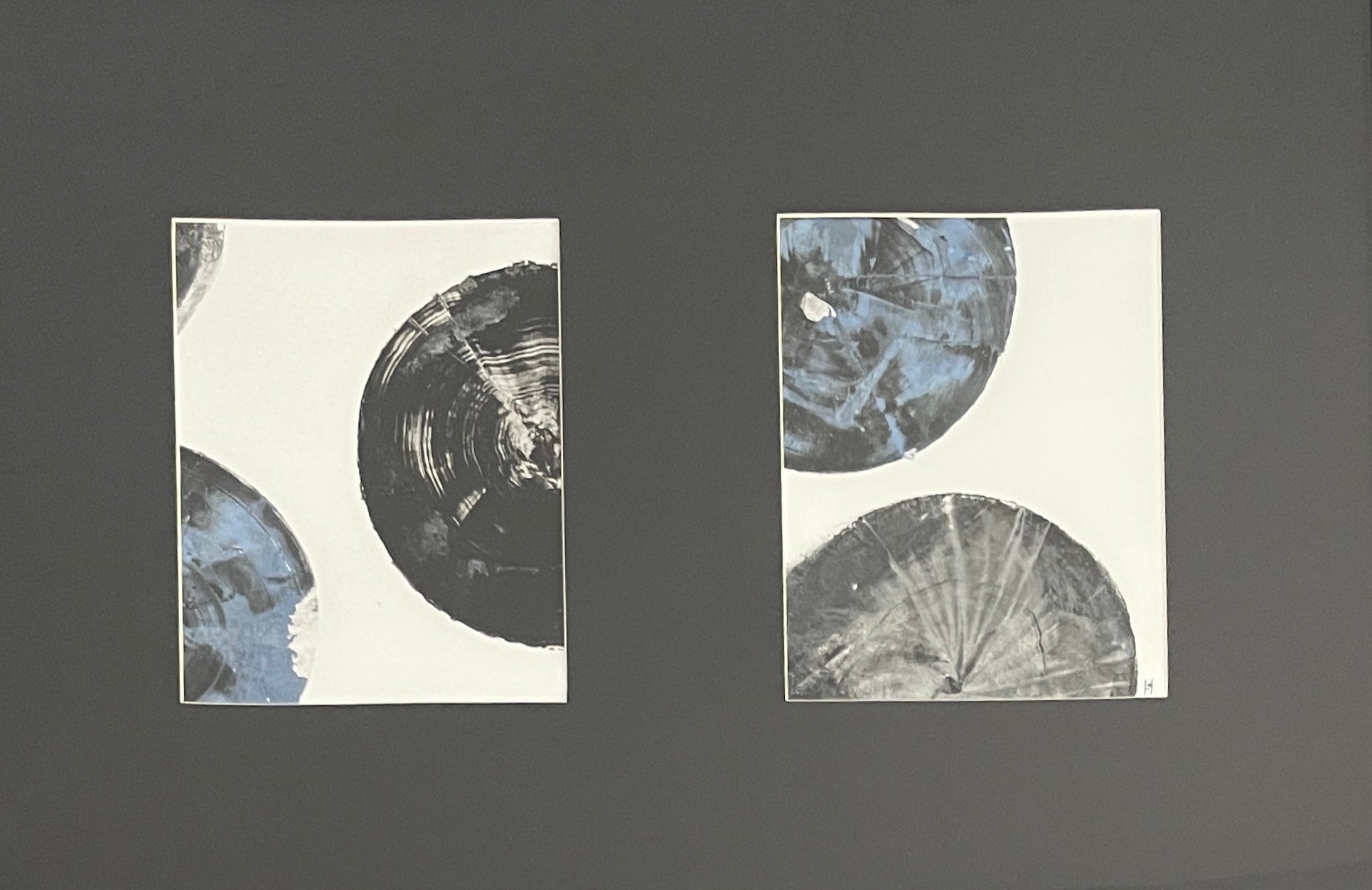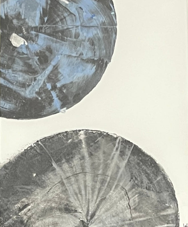 Two minimalist monoprints feature abstract log cross sections — rendered in deep cobalt blue and in bold black — on two sheets of textured white paper. The circular forms reveal delicate, organic ring patterns that evoke time, nature, and resilience. Though printed separately, the pieces are framed together in a single, clean frame, creating a quiet dialogue between color, form, and negative space. The paired composition balances contrast and unity, offering a modern yet organic feel that celebrates the beauty of natural structure and simplicity.
